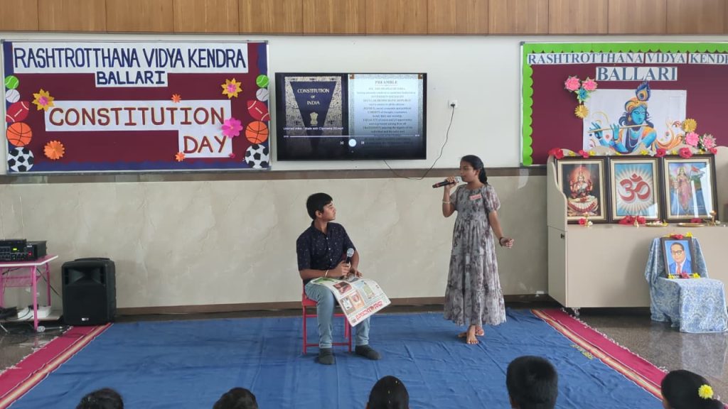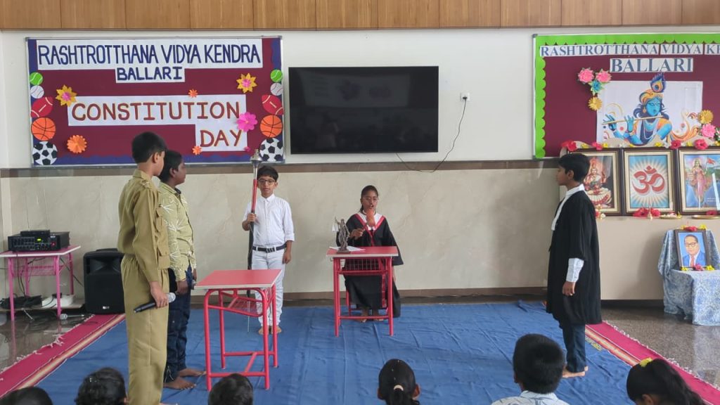 Ballari, Nov. 26: Constitution Day was celebrated herein Rashtrotthana Vidya Kendra – Ballari.Students in their speeches emphasized the fundamental rights and duties and upheld the spirit of the Constitution.Children performed a short play to create awareness about rights.
