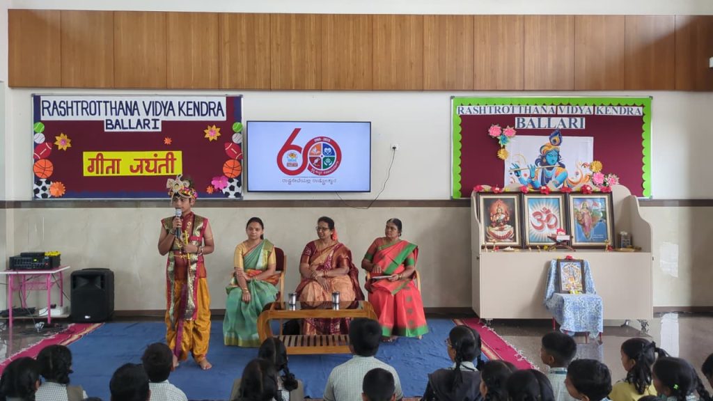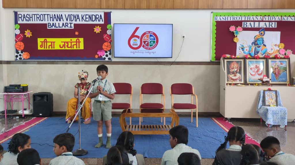 Ballari, Dec. 1: Gita Jayanti was celebrated herein Rashtrotthana Vidya Kendra – Ballari.Smt. Madhavi Latha Bhadrachalam and Smt. Neelamma were graced the program.Darshil of class 6 displayed the costume of Lord Krishna, Children of classes 1 to 7 participated in a competition to recite verses from Bhagavad Gita.Certificates were given to the winners.The chief guest addressed the children, motivating them for greater participation and understanding the inner meaning of our culture and Bhagavad Gita.Pradhanacharya Smt. Saraswati said that Lord Krishna is believed to symbolize tenderness, patience, mercy and love, he is an incarnation or avatar of the god Vishnu, the protector.