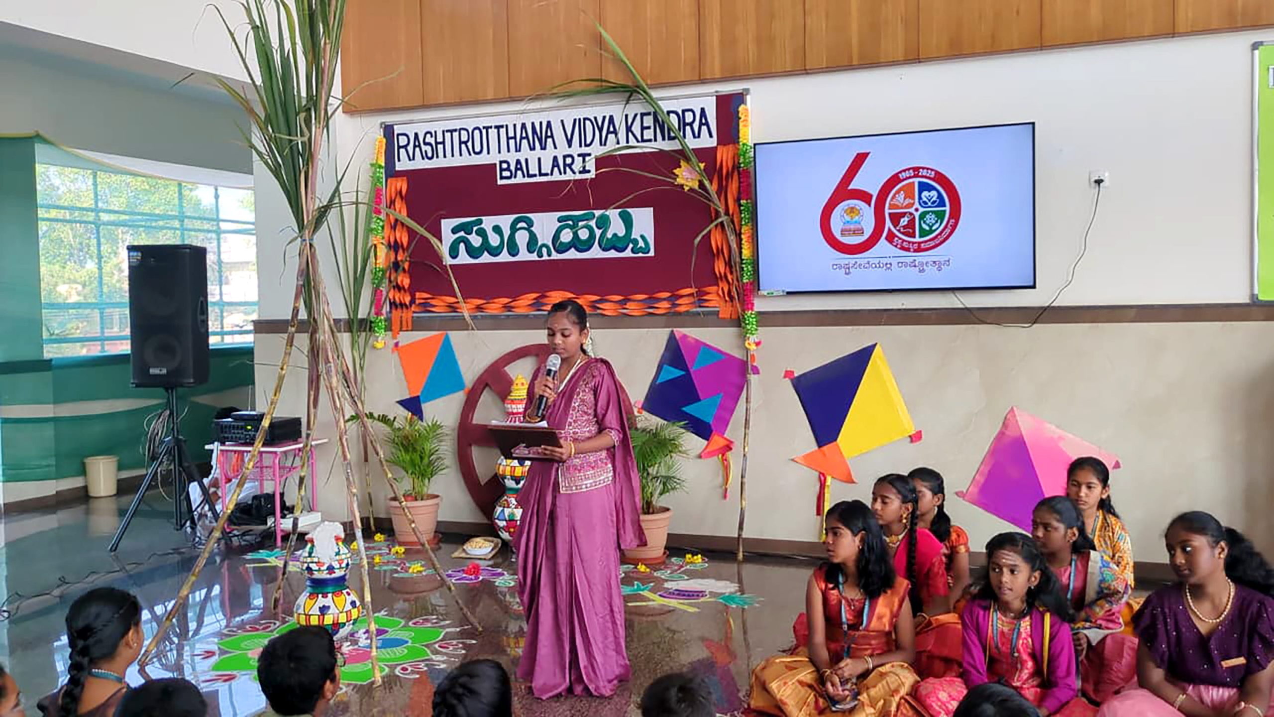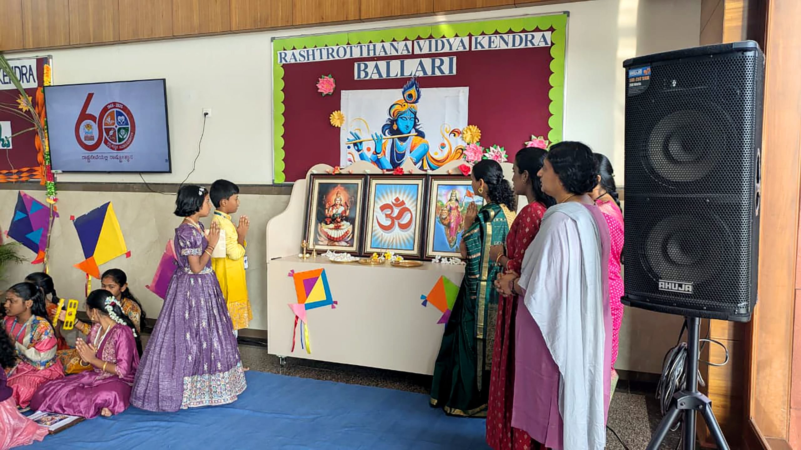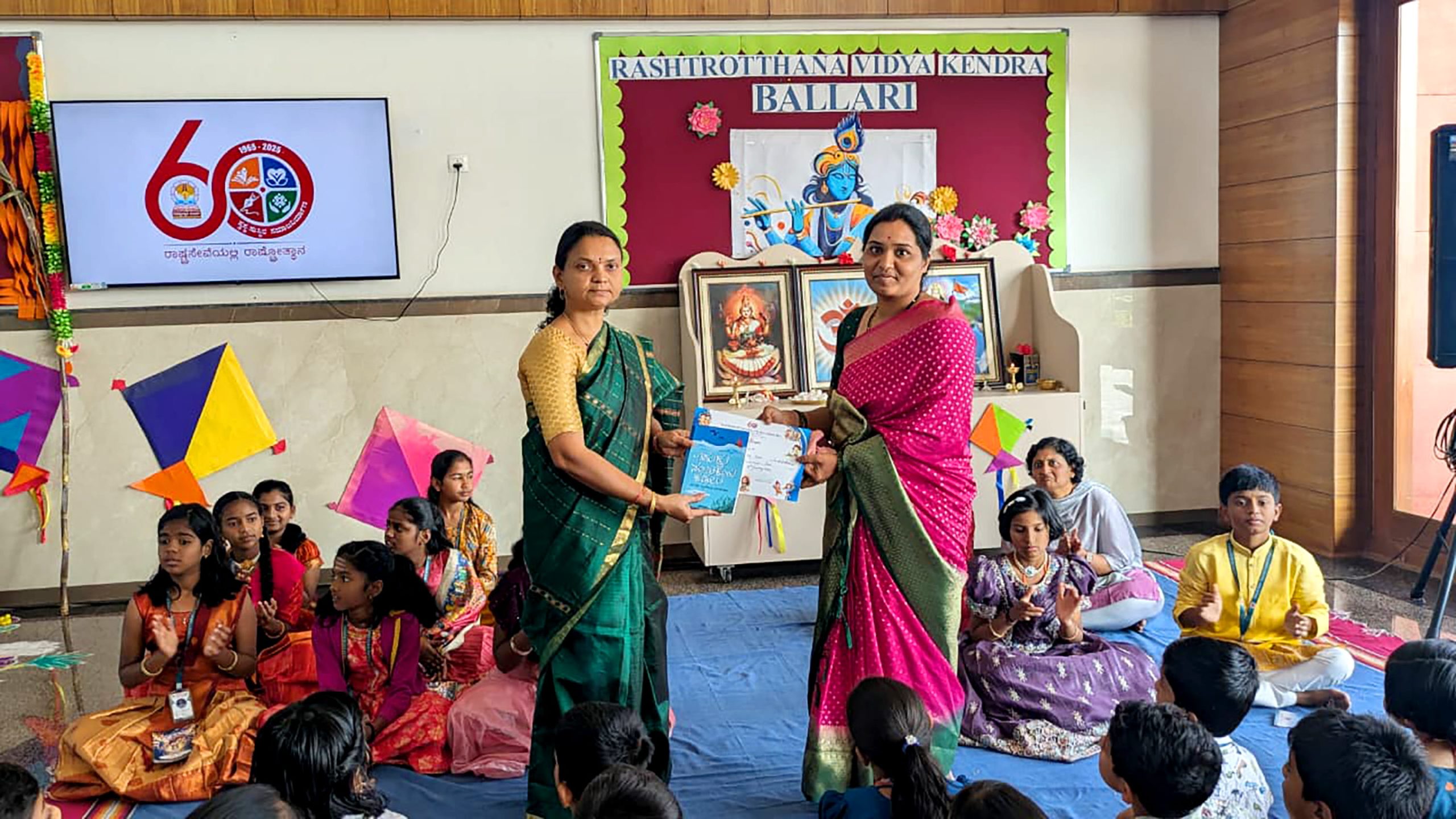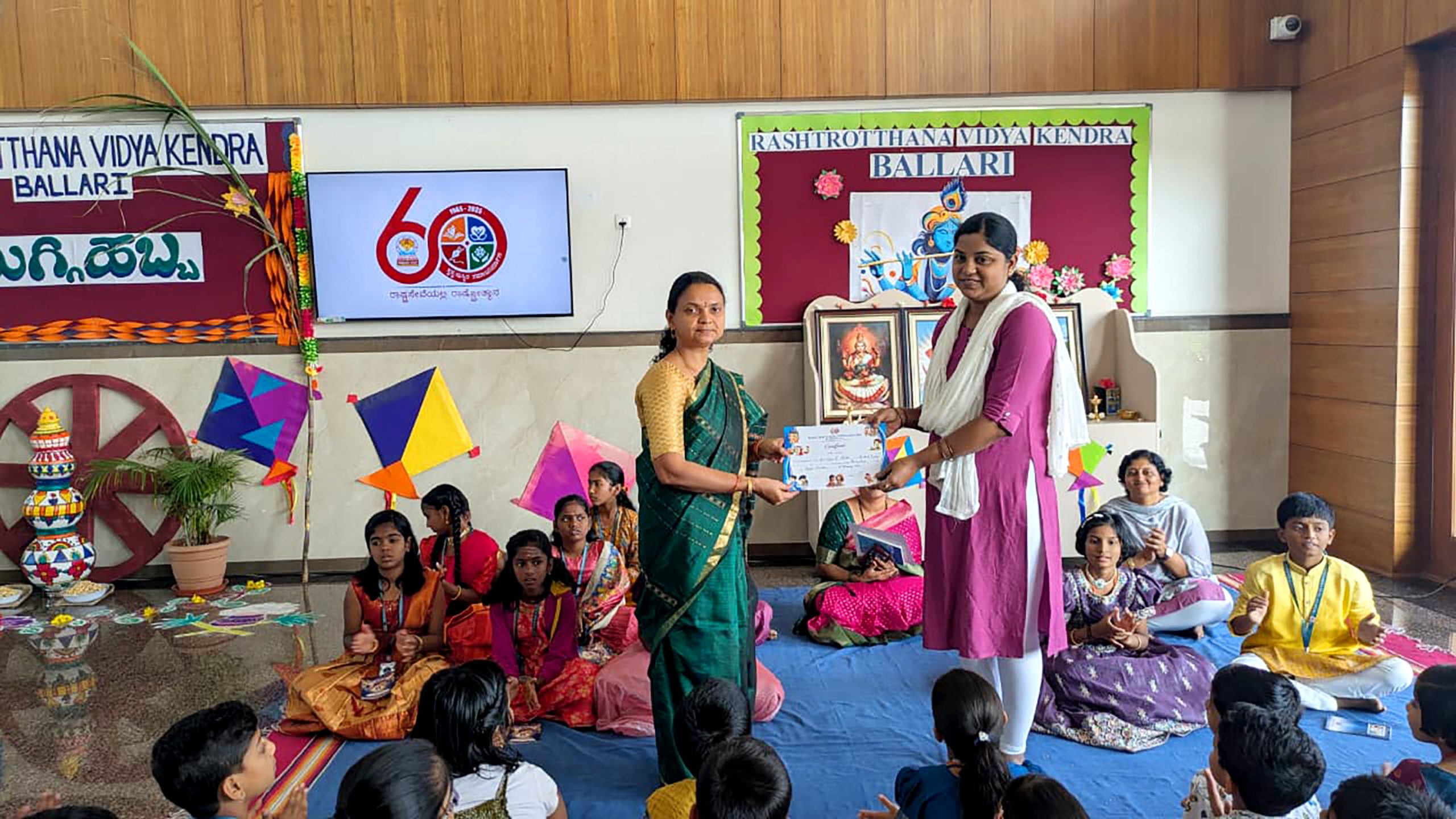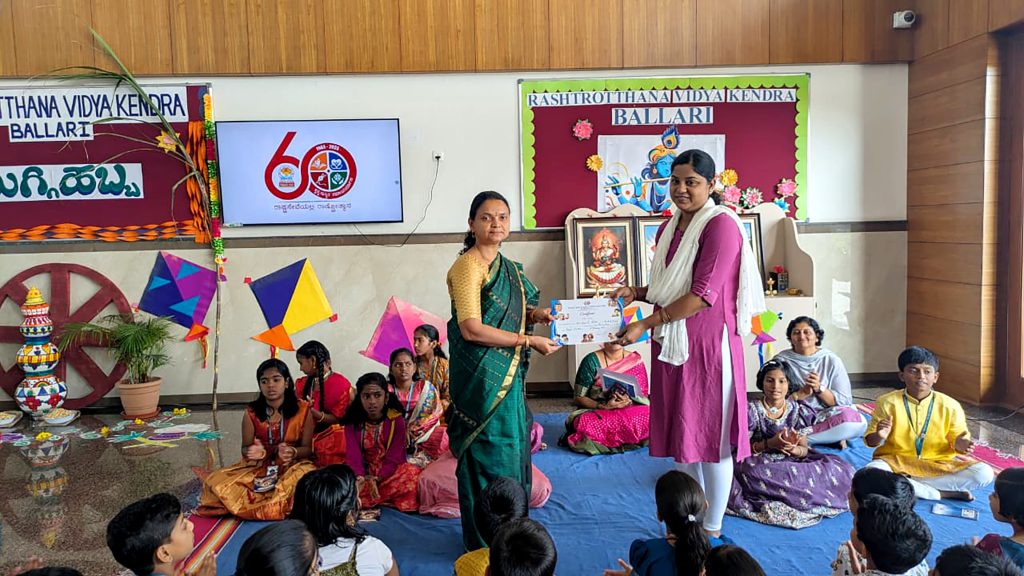 Ballari, Jan 14: The Rashtrotthana Vidya Kendra – Ballari organized a Suggi festival event. The students explained the significance of celebrating the Suggi festival. In connection with the Sankranti festival, a Rangoli competition for Mother’s was also arranged on the date: 13.01.2026. The mothers who participated in this competition with joy and enthusiasm were awarded certificates of achievement. The principal enlightened the children about the scientific and traditional aspects of Makar Sankranti celebrations. Smt. Renuka, the music teacher, sang a song about the Suggi festival collectively with the children. The event concluded with the singing of Vande Mataram. The mothers of Bharat distributed sesame, jaggery, and peanuts to the children.