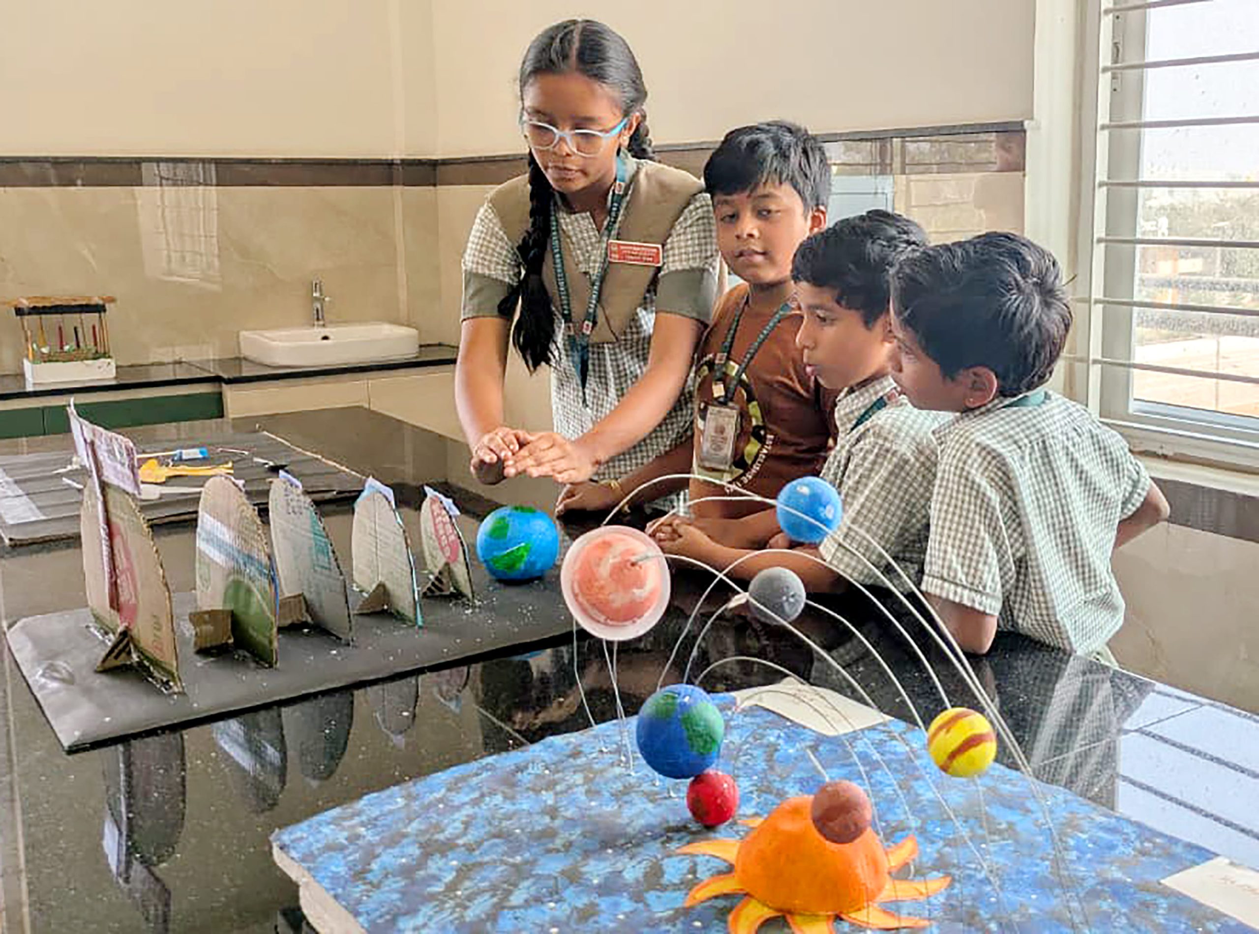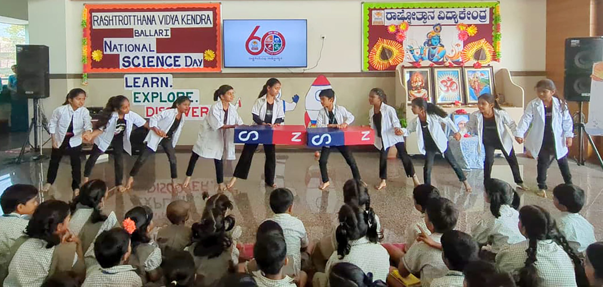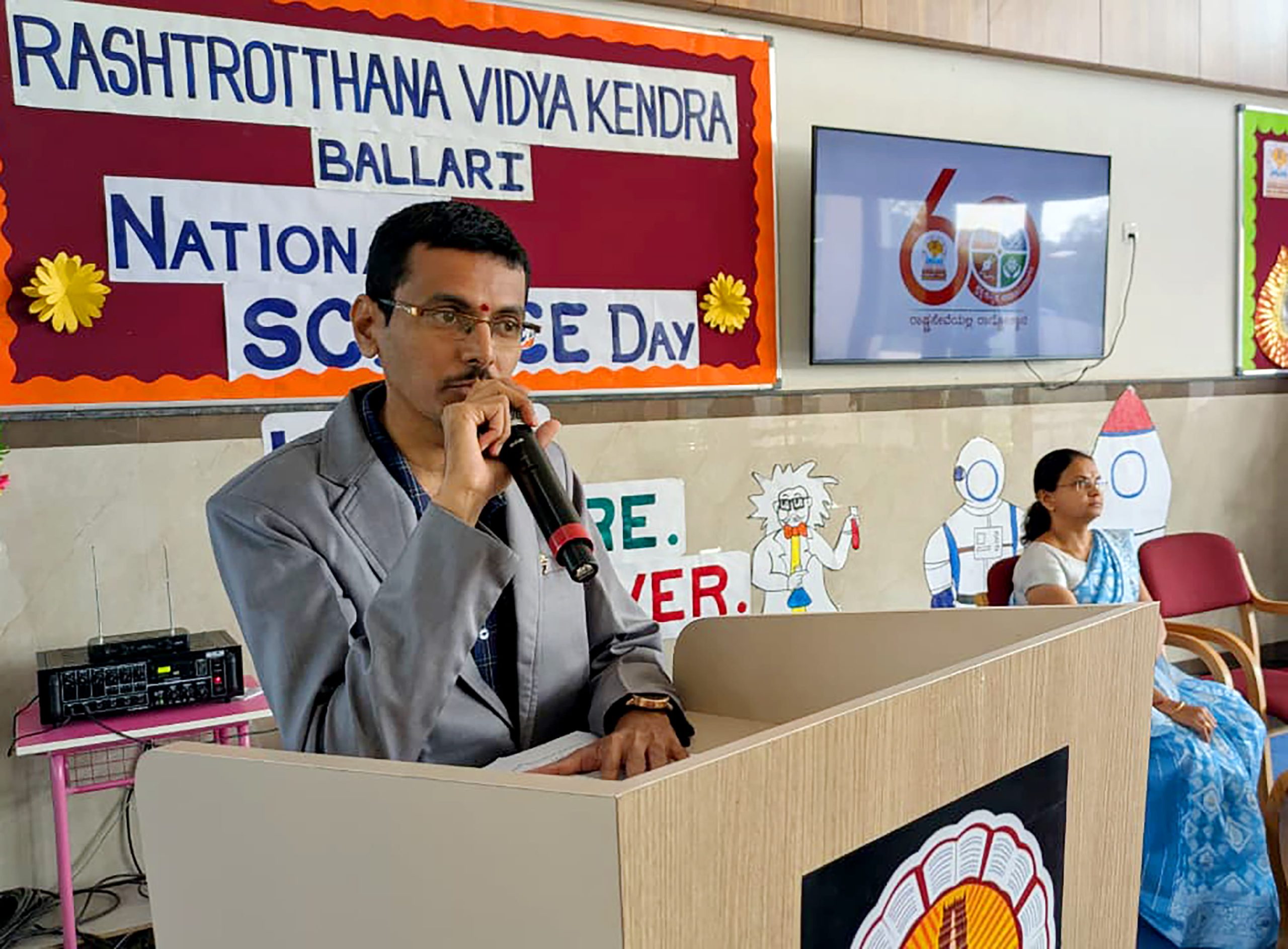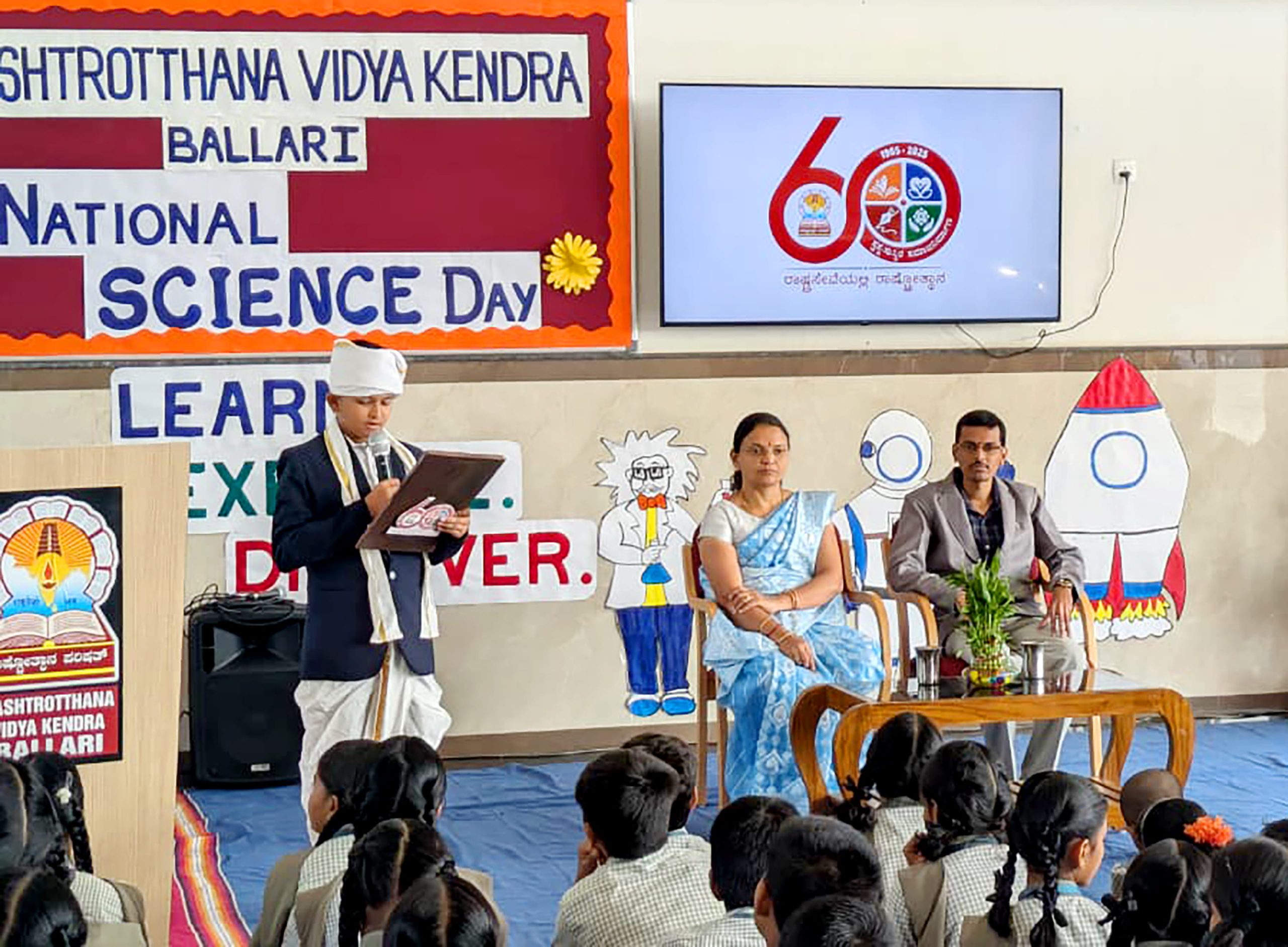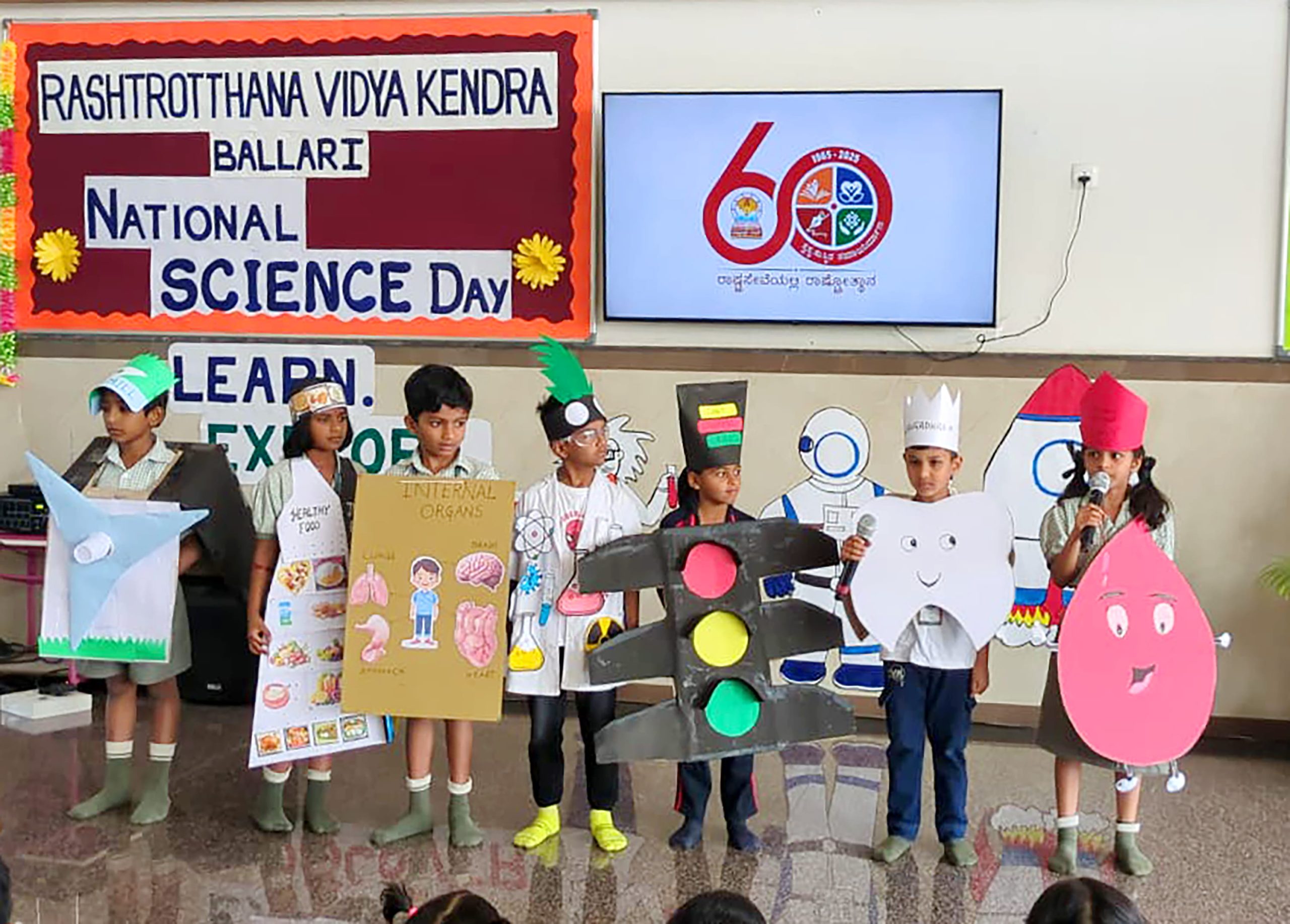 Ballari, Feb. 26: Science Day was celebrated herein Rashtrotthana Vidya Kendra – Ballari. Young scientist Sri Hemanth was the chief guest. Smt. Haripriya highlighted the importance of celebrating National Science Day. Students spoke about the significance of the day and explained how science plays an important role in our daily lives and inspires innovation and discovery. Chief guest Sri Hemanth Kumar T. G. addressed the students and gave an inspiring speech, encouraging young minds to be curious and explore the wonders of science through observation and experiments. Pradhanacharya Smt. Saraswati emphasized on the theme of Science Day and the importance of cultivating scientific thinking. Gokulam students performed a dance based on the theme of senses The students of class 1 and 2 performed fancy dress performances depicting blood, scientists, windmills, internal organs, zinc and healthy food, teeth and traffic signs, health environment and scientific concepts. The students of class 3 performed a dance on science song. The chief guests and the Principal inaugurated the festival with a show of “Invisible Ink Magic”.